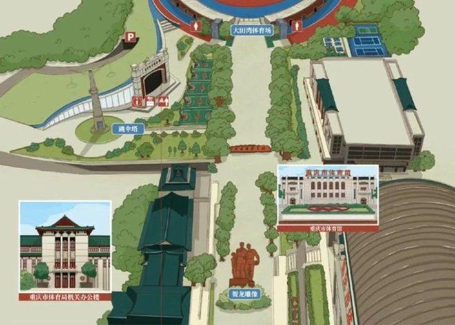 从博物馆出发,咫尺之遥便是饱含民族建筑智慧的重庆市体育局机关办公楼。这座、、贺龙主政西南时期修建的朱门绿瓦建筑,1954年起便作为重庆体育管理的中枢。与之辉映的重庆市体育馆,同样由老一辈革命家决策建成,作为新中国最早的现代化体育设施之一,其飞檐斗拱之下曾上演世界杯拳击赛、世界女排大奖赛等无数经典赛事。馆前广场矗立的《贺龙与运动员在一起》大型红色花岗石群雕,镌刻下贺龙元帅对重庆乃至新中国体育事业的卓著功勋。