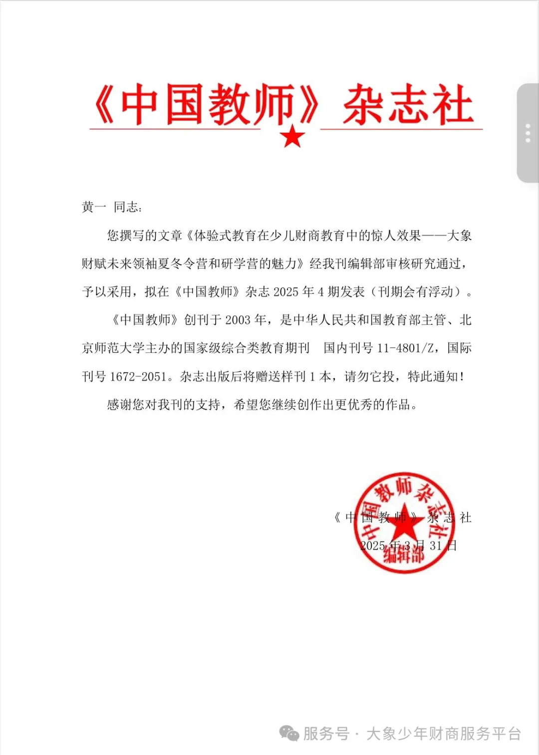 北京,2025年6月7日 教育界传来振奋人心的消息。知名财商教育家黄一老师撰写的深度学术文章《体验式教育在少儿财商教育中的惊人效果大象财赋未来领袖夏冬令营和研学营的魅力》,正式发表于国家级综合类教育权威期刊《中国教师》杂志2025年第四期。该文以大象财商教育集团旗下标杆项目“财赋未来领袖”夏冬令营及研学营为研究样本,系统揭示了体验式教育模式在青少年财商素养培育中的突破性成果,引发教育界、学术界及家长群体的广泛关注。