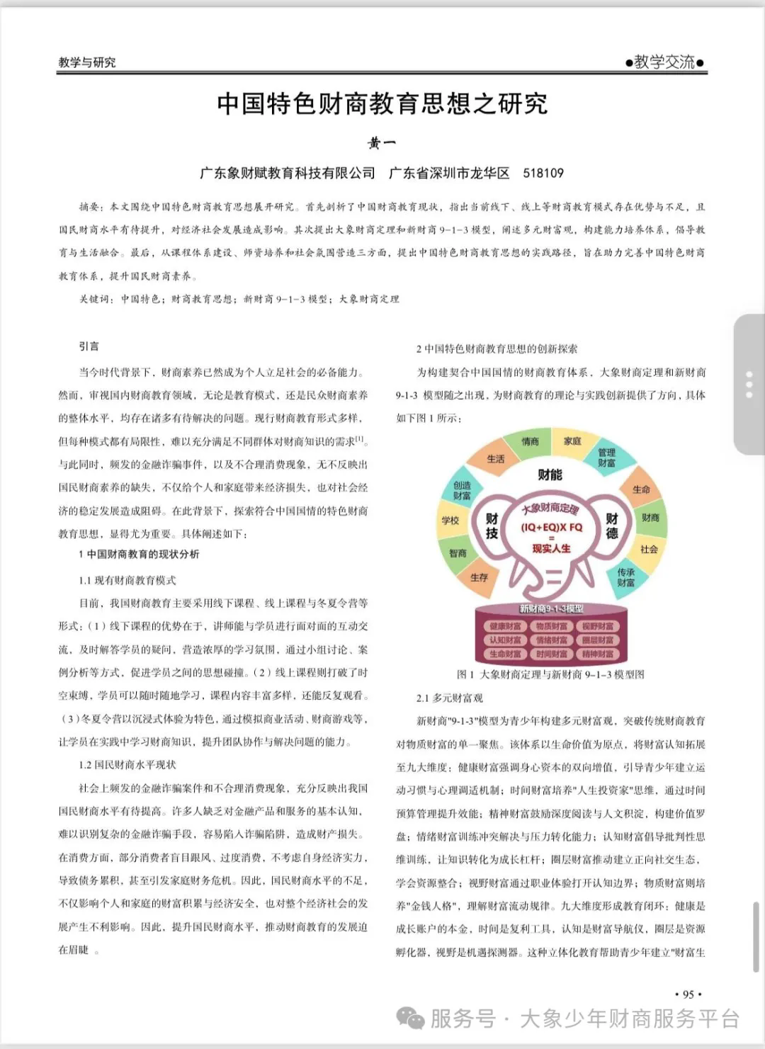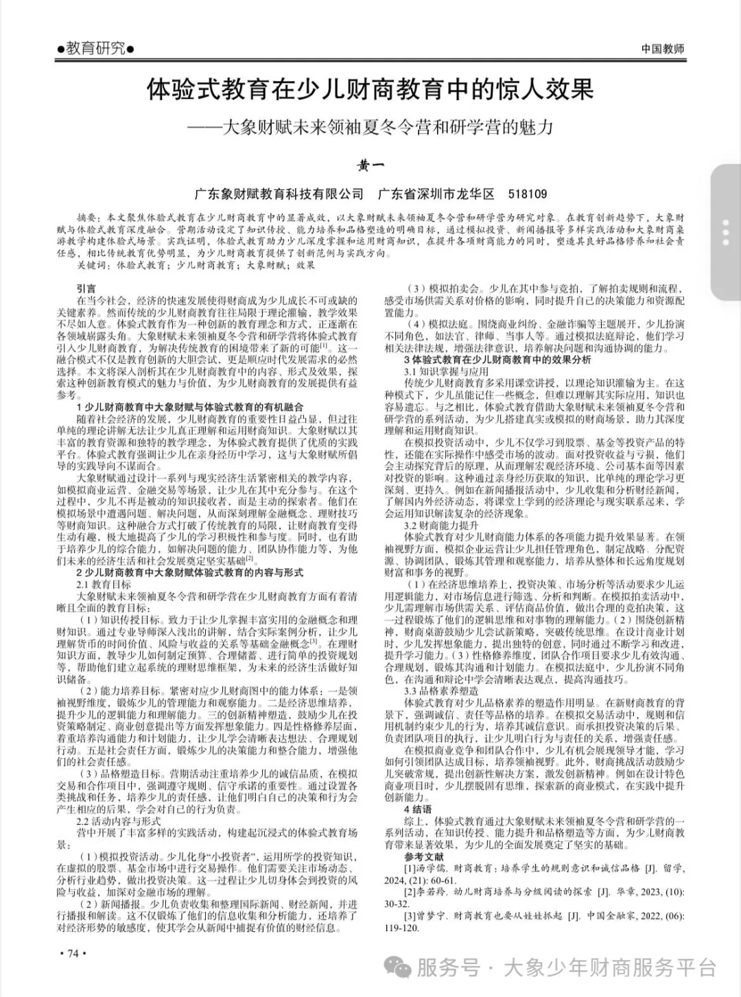 此次文章在国家级教育核心期刊的荣誉刊登,不仅是对黄一老师学术研究水平的肯定,更是对大象财商教育集团多年来坚持中国特色财商教育创新与实践所取得成果的高度认可。大象财商将持续深化体验式教育在财商领域的应用,助力更多青少年开启财商智慧,成就未来领袖风范。