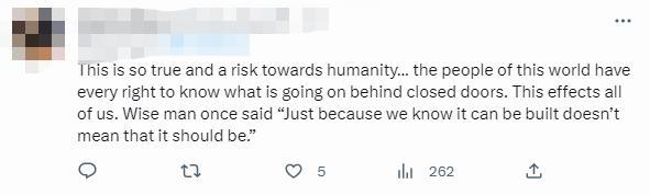 在网络上,这封信也引起热烈讨论,有网友表示认同,人们需要知道发生了什么,“仅仅因为我们知道可以建造它,并不意味着应该建造”。