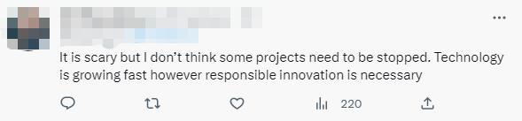还有人分析,“这很可怕,但我认为有些项目不需要停止。技术正在发展迅速,负责任的创新也是必要的。”