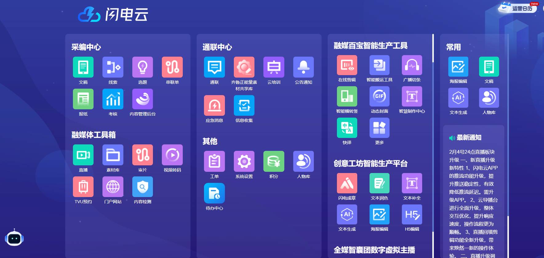 为了进一步优化融媒生产流程,简化操作步骤,提升用户使用体验,闪电云平台全面改版,持续上线各类AI智能工具,全面更新界面设计。
