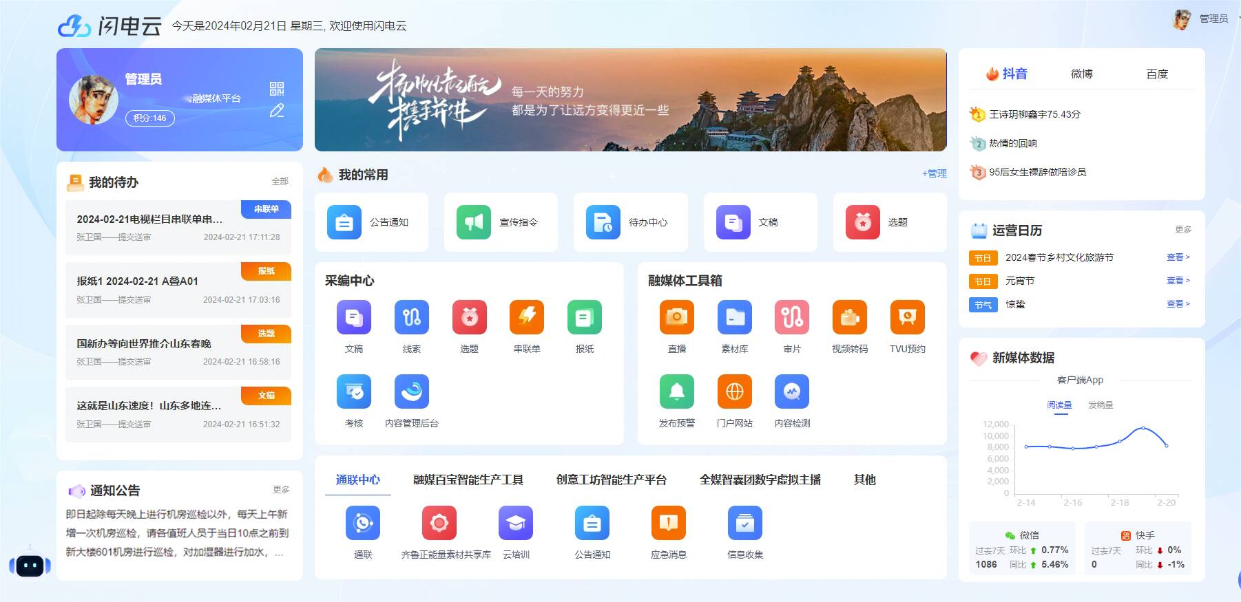 右侧运营支撑台汇聚全网热点信息,可一键获取省平台每月上线的运营支持素材,并一目了然查看近期的节日节气。同时下方的各平台运营数据可以作为运营策划和选题的重要参考。