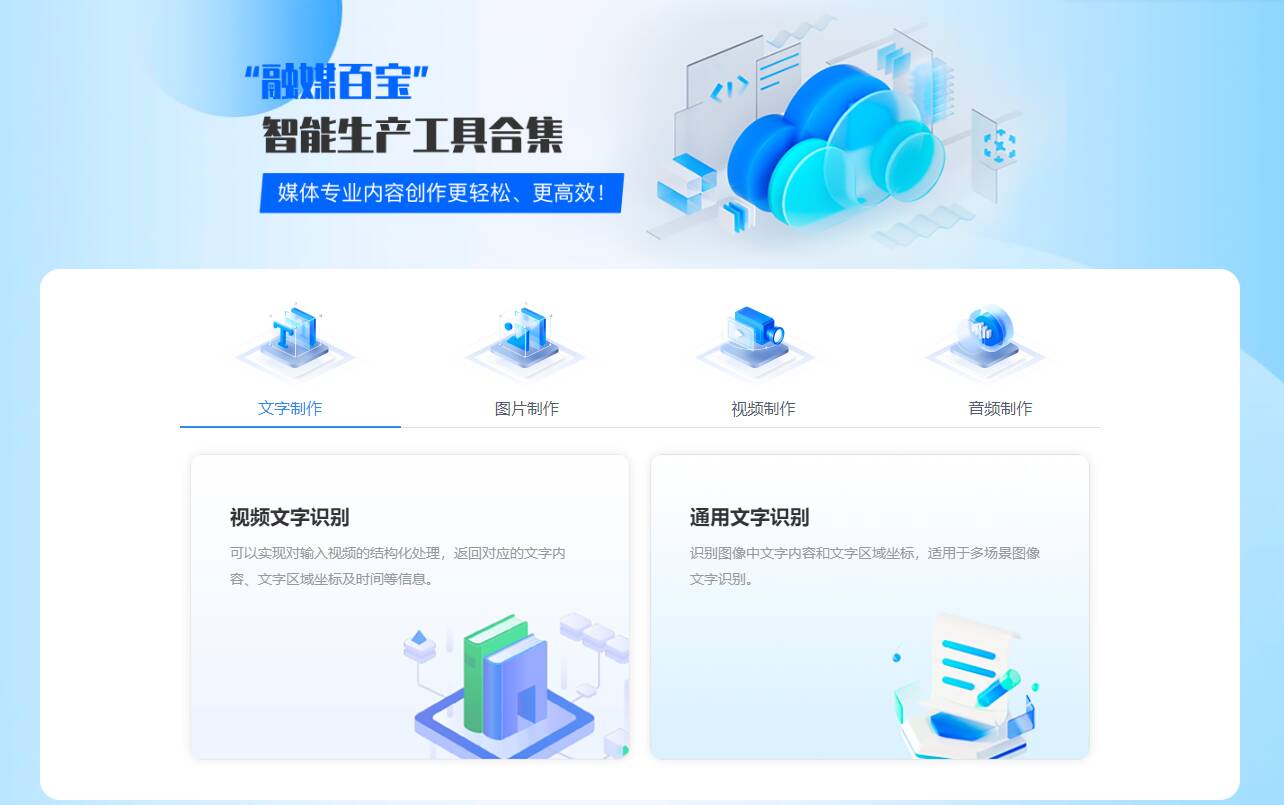 中部AI智能工作台功能分区简洁直观。集合了多种AI创作工具,包含融媒百宝智能生产工具、创意工坊智能生产平台、全媒智囊团数字虚拟主播、智能小融等,可为融媒内容生产提供9000万+图片、元素、字体等素材,30万+设计模板,辅助融媒体工作者进行快速的文稿生成和润色、图片编辑、H5编辑、音视频处理。