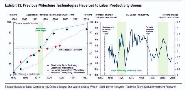 以主导当前科技进程的生成式AI浪潮为例,据高盛研报测算,在生成式AI发展的10年内,每年可以将生产力提高超1.5%。最为显著的一点,技术正让诸如文档数字化、文本识别类功能变得更为强大,AI类效率工具开始进入一个寒武纪——