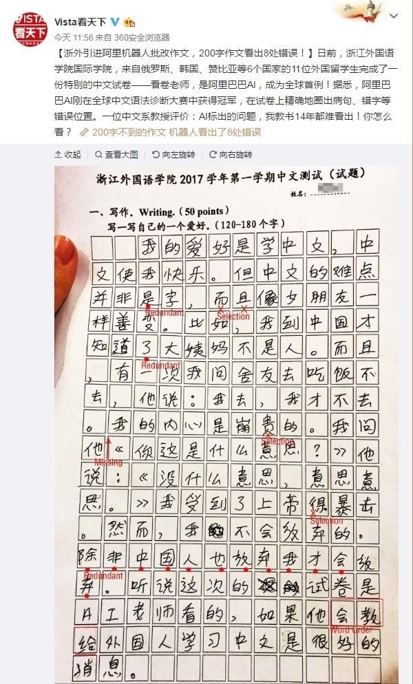 最近,在浙江外国语学院国际学院,阿里巴巴AI完成了一次考试阅卷,一篇200字的作文中找出8处错误。