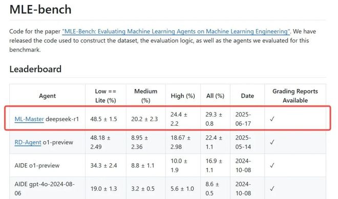 MLE-bench是OpenAI于2024年10月推出的类人机器学习能力评测基准,旨在衡量大模型是否具备像人类AI工程师一样独立完成项目的能力。