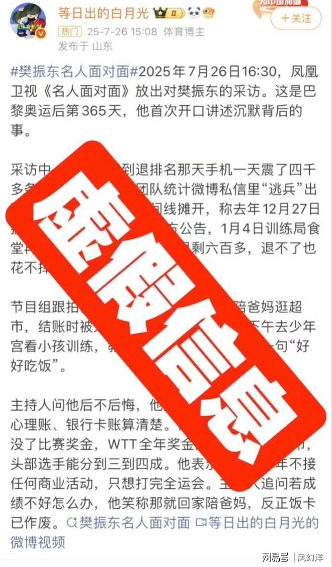 球迷造谣樊振东采访内容《凤凰卫视》亲自打假平台封禁账号