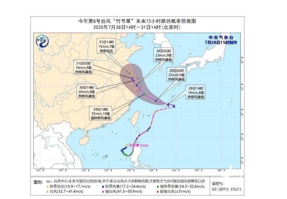 今年第8号台风“竹节草”的中心28日14时位于浙江省舟山市东偏南方向约700公里的琉球群岛以东洋面上,中心附近最大风力8级(18米/秒),中心最低气压为992百帕。预计,“竹节草”将以每小时20—25公里的速度向西偏北方向移动,强度缓慢增强,将于29日下午到夜间在浙江北部到江苏南部一带沿海登陆。