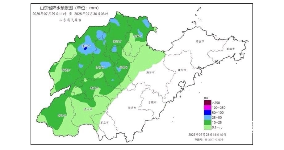 7月28日,记者从山东省气象台了解到,受高空槽和副热带高压边缘暖湿气流影响,预计7月29日中午到夜间我省有一次较明显降雨过程,部分地区伴有雷电、短时强降水和7—9级局部10级以上雷雨大风。全省平均降水量5—15毫米,其中,菏泽、济宁北部、泰安、济南、淄博、潍坊北部、聊城、德州、滨州和东营有中雨局部大雨或暴雨(10—25毫米局部50毫米以上),最大小时降水量30—50毫米,其他地区天气多云。