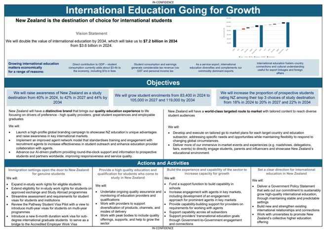 近期,新西兰政府正式发布《国际教育增长计划》(International Education Going for Growth Plan),以 激励全球学子,联结多元未来为核心理念,该计划设定的目标:2034年国际教育产业经济贡献值翻倍至72亿纽元。