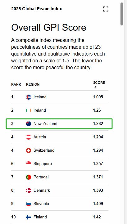 新西兰被公认为全球最安全、最宜居的国家之一,连续多年在《全球和平指数》中名列前茅,在2025最新的排名中,新西兰位列第3位。