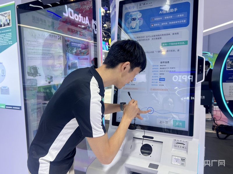 展台另一侧,在上海璞石医疗科技有限公司的AI智能数字人终端前,一位观众正在体验数字问诊,数字人与观众的语音交互流畅如真人对话。上海璞石医疗科技有限公司项目经理孙孟想介绍,此次璞石医疗展示出的AI智能自助服务系统可通过语音对话形式便捷完成挂号、缴费等工作,而AI智能数字人导诊系统则可通过数字人问答形式提供预问诊、导诊等服务,可极大优化患者就医体验与就医效率。