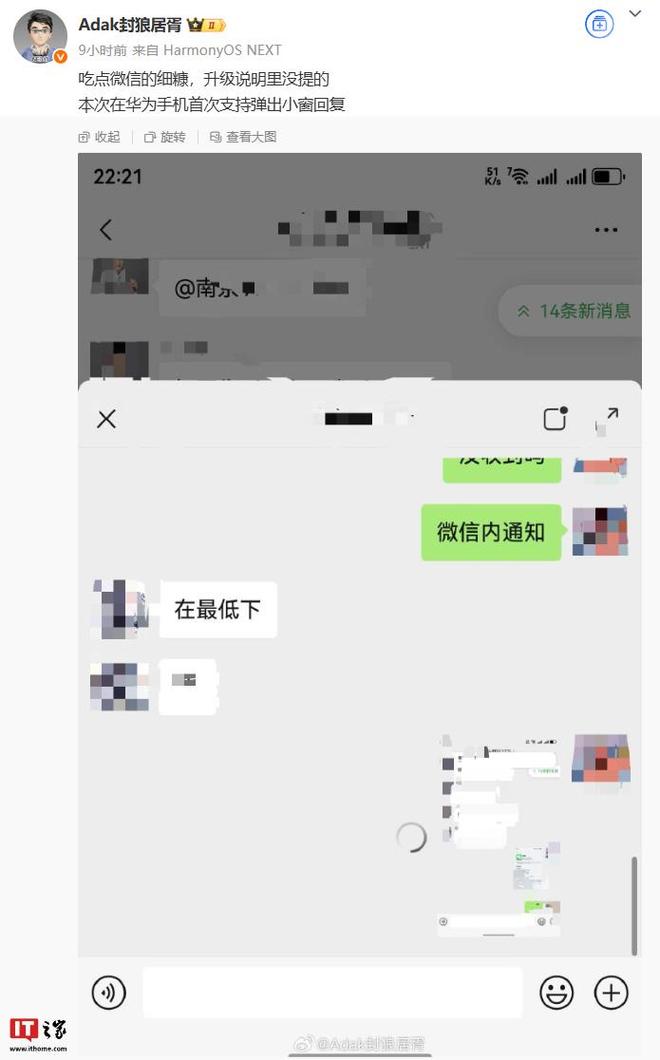消息称微信鸿蒙 App 邀测版支持华为手机弹出小窗回复