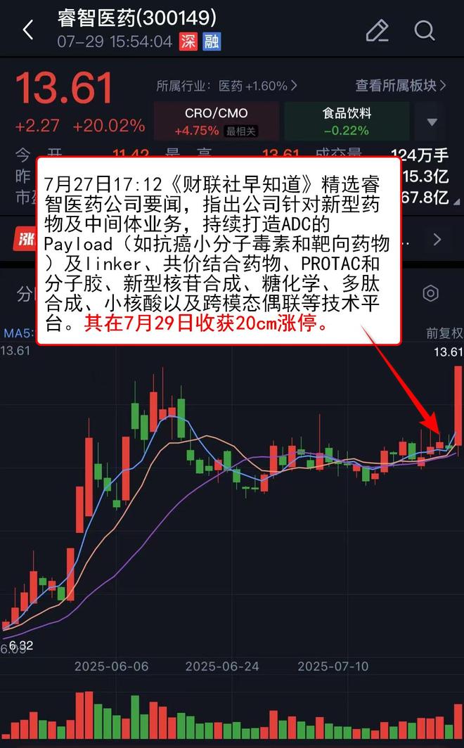 7月27日17:12《财联社早知道》 精选睿智医药公司要闻,指出公司专注于为全球制药企业、生物技术公司及科研院所提供涵盖化学药和生物药从早期研发到商业化生产的一站式服务,针对新型药物及中间体业务,持续打造ADC的 Payload(如抗癌小分子毒素和靶向药物)及linker、共价结合药物、PROTAC和分子胶、新型核苷合成、糖化学、多肽合成、小核酸以及跨模态偶联等技术平台。其在7月29日收获20cm涨停。