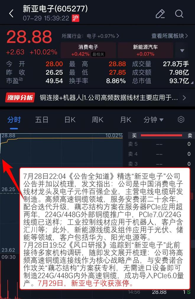 7月28日22:04《公告全知道》 精选“新亚电子”公司公告并加以梳理,发文指出:公司是中国消费电子线材龙头及电子元件百强企业,主营电线电缆研发制造。高频高速铜缆领域,服务安费诺二十余年,配合迭代升级,藕芯结构方案在服务器PCIe应用超两年,224G/448G外部铜缆推广中,PCIe7.0/224G线缆已送样;工业控制线材应用于机器人,客户含汇川等;此外,新能源线缆及组件应用于光伏、储能等领域,客户包括华为、阳光电源等。
