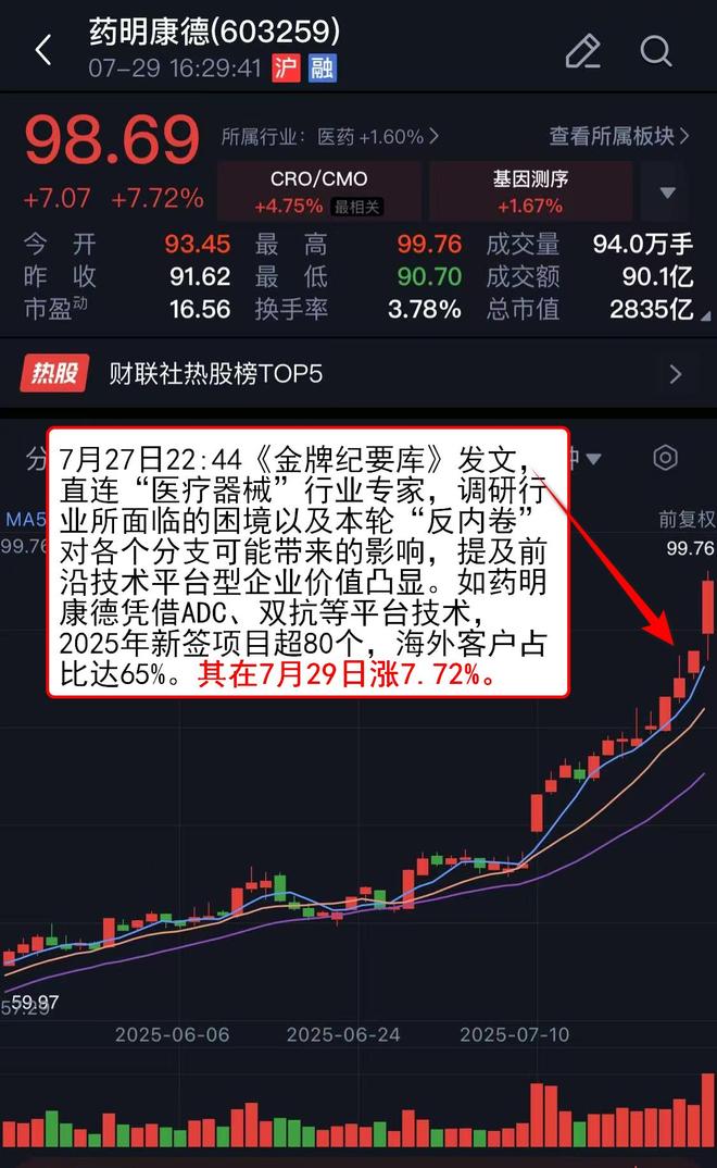 7月27日22:44《金牌纪要库》发文,直连“医疗器械”行业专家,调研行业所面临的困境以及本轮“反内卷”对各个分支可能带来的影响,提及前沿技术平台型企业价值凸显。如药明康德凭借ADC、双抗等平台技术,2025年新签项目超80个,海外客户占比达65%。其在7月29日涨7.72%。