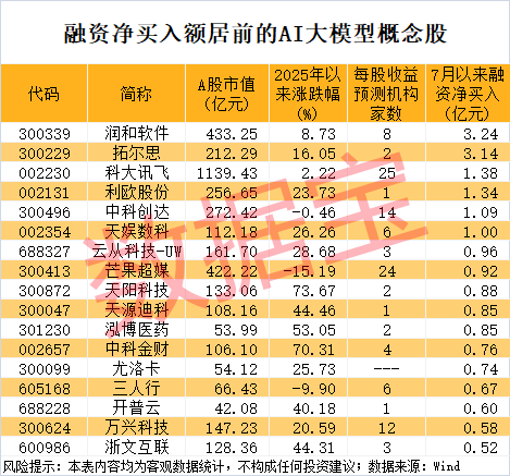 资金面上,据数据宝统计,7月以来融资净买入超千万元的AI大模型概念股有34只,润和软件、拓尔思和科大讯飞等个股获融资净买入均超亿元,润和软件融资净买入额3.24亿元,排在首位。