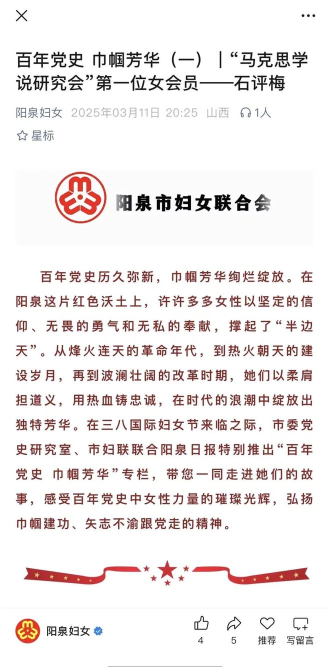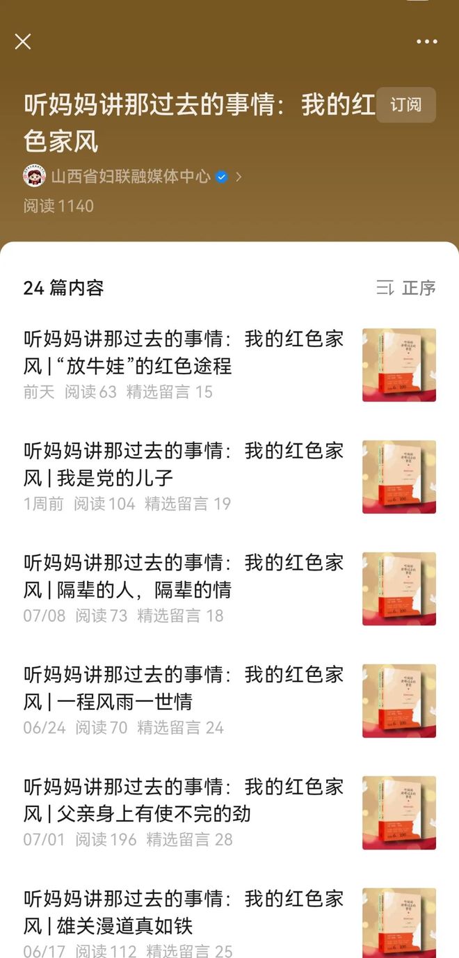 省妇联推出专栏“听妈妈讲那过去的事情:我的红色家风”,以百篇鲜活故事展示山西老一辈员的红色家风图谱,让广大妇女在红色家风中感悟信仰力量,从革命家训里汲取前行智慧。阳泉市妇联举办“百年党史 巾帼芳华”阳泉党史上杰出女性故事宣讲活动,讲述“马克思学说研究会”第一位女会员石评梅、新中国第一位女采煤队长苏景云等阳泉党史上杰出女性的感人故事,并在媒体开办专栏,宣介10位在阳泉党史上做出杰出贡献的女性。