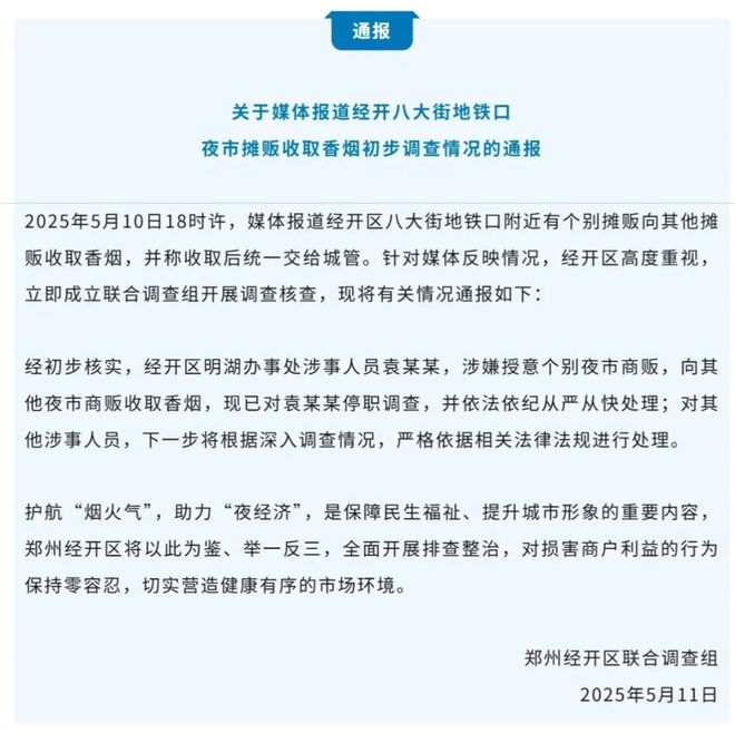 5月11日晚,“郑州经开发布”公众号发布《关于媒体报道经开八大街地铁口夜市摊贩收取香烟初步调查情况的通报》: