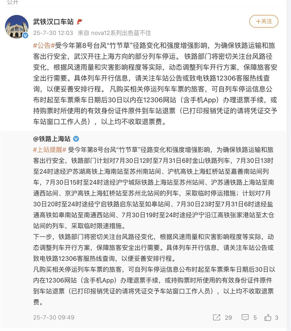 30日中午,极目新闻记者从武汉铁路部门获悉,受今年第8号台风“竹节草”径路变化和强度增强影响,为确保铁路运输和旅客出行安全,武汉开往上海方向的部分列车停运。