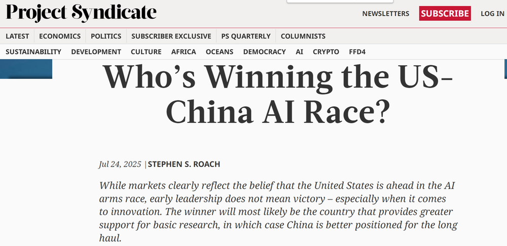 美国摩根士丹利亚洲区前主席斯蒂芬·罗奇在报业辛迪加网站(ProjectSyndicate)发表文章指出,全球人工智能(AI)竞赛的胜负取决于基础研究的投入,而非短期市场表现。罗奇认为,中国凭借产业生态、研发投入和文化传统,使其在长期竞争中占据优势。