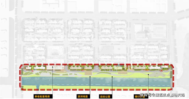 一界面是滨水景观界面(项目红线外),依托南侧的天然水系及滨水公园,打造慢行景观系统,并将滨河栈道、运动公园、骑行等多种功能嵌入,提升舒适度的同时,也为居民提供放松身心的好去处。