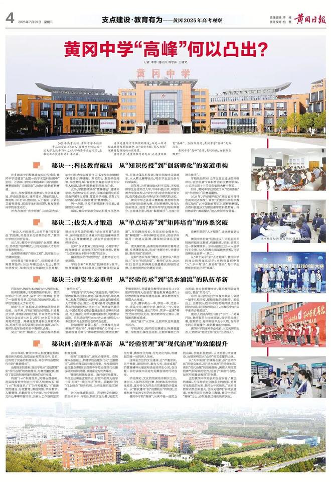 7月29日,《黄冈日报》聚焦黄冈中学的“成功基因”,以《黄冈中学“高峰”何以凸出?》为题,深入解读学校四大核心秘诀——