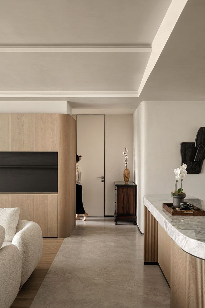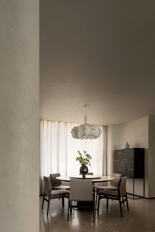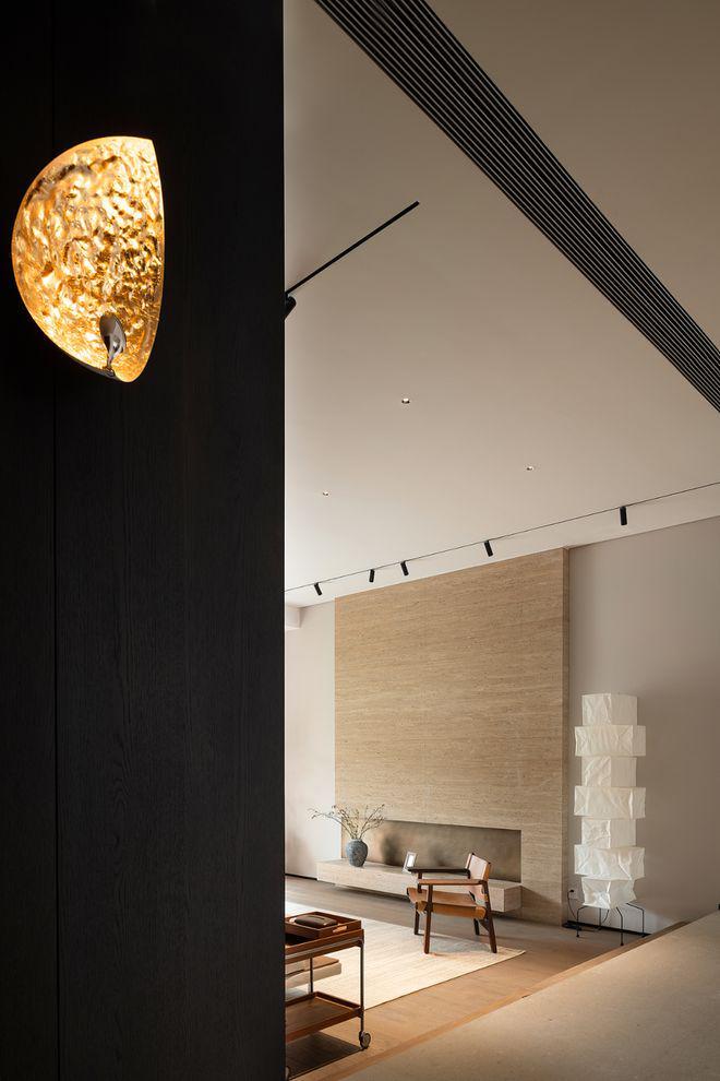 我们有意识地避免过度装饰,追求一份随性自在的松弛。空间中的质感、肌理、颜色给人的感触是温润的。深黑素雅的墙面,给予想象的静谧感;在暖色光源的照射下,如同温柔的拥抱;天然洞石拥有接近自然表皮的肌理,有着拙朴之美,带给人安定的情绪。