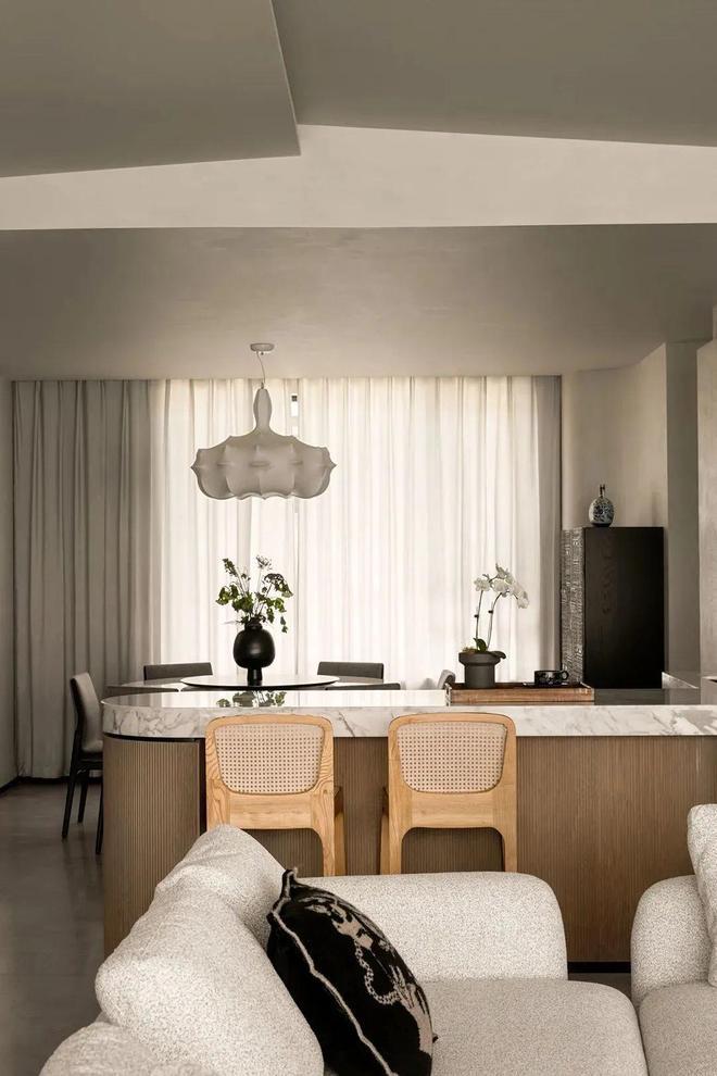 厨房、餐厅、吧台的结合十分轻盈,松弛的生活态度随处可见,厨房位于角落处,让油烟终止在角落,为其他区域带来了更多的舒适感。