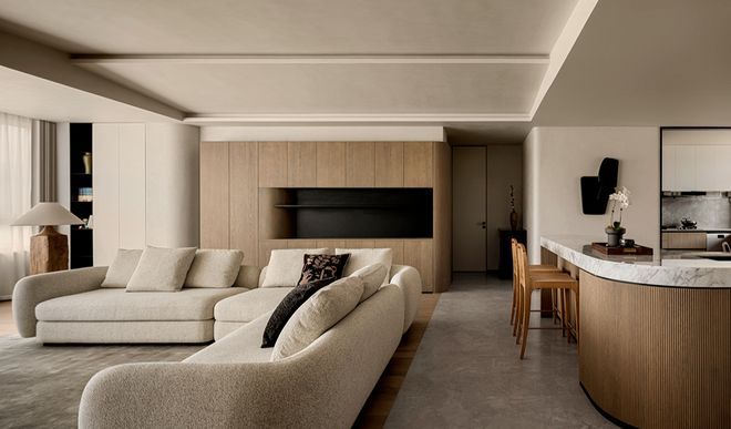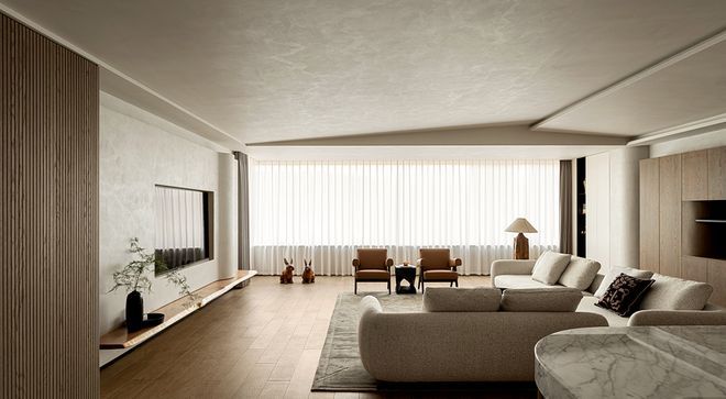 空间内随处可见的留白是设计赋予居住者自由思考的维度,同时也是空间灵动感的源泉,浅色地毯、L型沙发、皮革躺椅让家充盈且实用了起来。