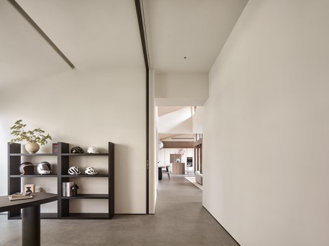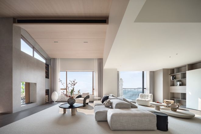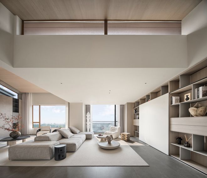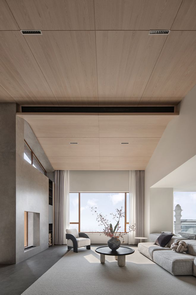 坡形顶的设计不仅提高了空间的视觉高度,也增加了空间的层次感和个性化艺术美感。通过巧妙隐藏空调风口等设备,整体空间变得简约干净。