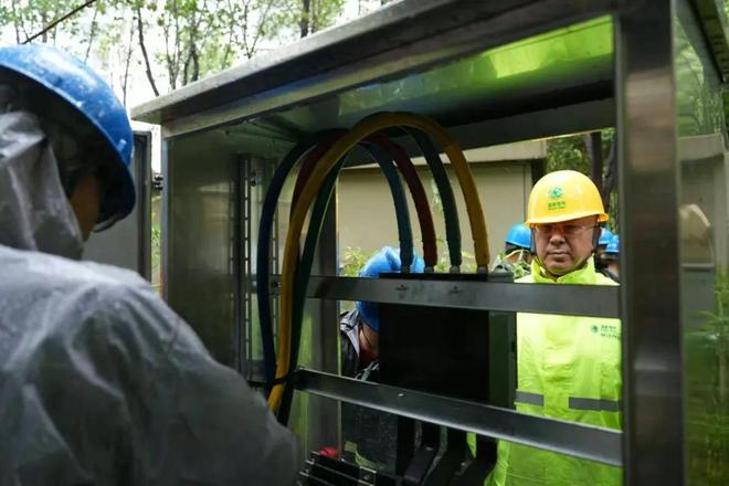 抵达现场后,抢修人员马上投入排查工作。经检查,故障原因是台风带来的强降雨导致户外箱变开关跳闸。对此,南大供服中心迅速调来了应急发电车,全力为居民恢复供电。在现场,市北供电公司南大供服中心副班长谢谦负责为发电车接入疏导交通,他一边指挥着交通,一边向过往居民耐心地做好解释工作,确保发电车能够顺利接入。与此同时,客户工程师周钟伟在现场紧张有序地组织应急发电车接入,并开展箱变抢修工作。他带领着其他抢修人员摇测电缆,确认故障位置,当发电车接入后立即更换开关,处理故障,最后恢复供电,保障居民的安全用电。恶劣的天气条件下,他们争分夺秒开展抢修,以最快的速度为用户恢复正常供电。