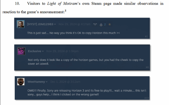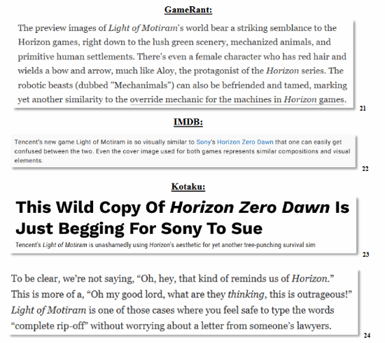 索尼的起诉书中还引用了多个外媒(如Kotaku、IMDB和GameRant)发布的新闻标题和评论,以及Steam和Reddit上玩家的言论,这些内容都指出了两款游戏之间的惊人相似性,并纷纷预测“索尼大概率会起诉”。