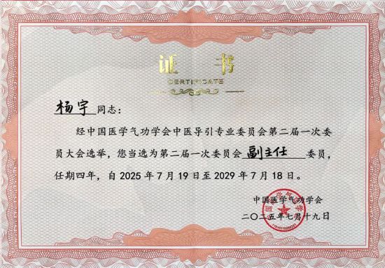 近日,在郑州举办的第五届中医导引学术研讨会上,全国中医药领域专家学者近200人参加了会议。会议代表围绕中医导引临床证据、作用机制、导引处方、三伏导引等专题举行了系列高水平报告和研讨。会议期间还进行了专委会换届选举,广西中医药大学第一附属医院壮医科/壮医针灸科杨宇教授被推选为中国医学气功学会中医导引专业委员会副主任委员。