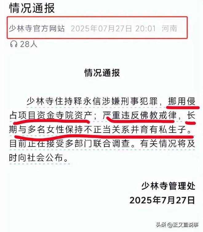 7月27日,少林寺管理委员会发布一则公告,核心内容指出,释永信涉嫌收受不当财物、与多名女性发生不正当关系,并造成意外后果,相关部门已启动调查程序。释永信对少林寺而言,不仅是一位住持,更是整个少林文化的象征。如今他陷入风波,犹如少林这座千年古刹的天柱倾塌。