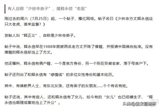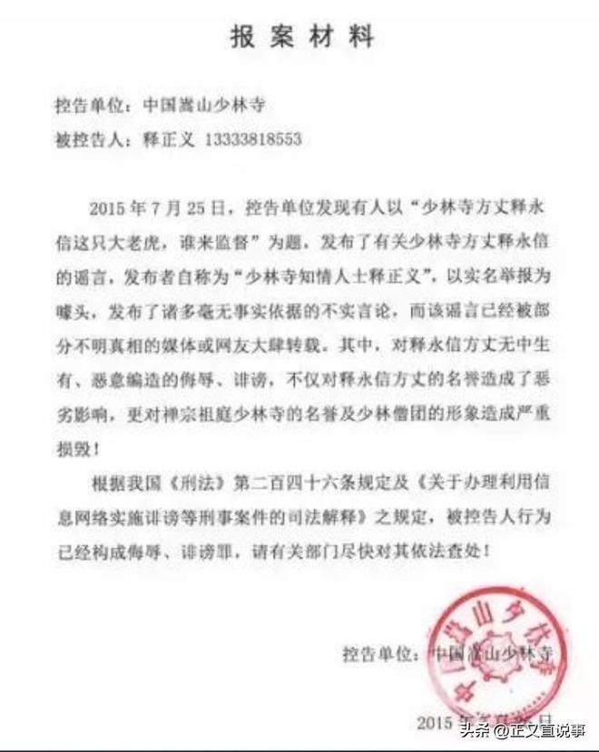 2015年,一封封详尽的举报信如同落入深潭的石子,激起波澜却未见底。一位自称“释正义”的网友在网络上揭露释永信的种种行为。