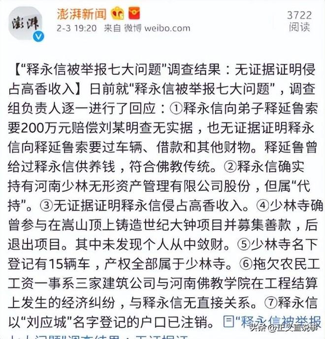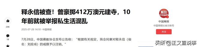 但他也以自身的贪婪与放纵,给予无数虔诚信徒一记沉重打击。那种信仰崩塌的冲击,是毁灭性的,伤害的不仅是少林寺本身,更是整个社会对宗教的信任基础。当寺庙成为公司,当住持化身总裁,当信仰可以标价出售,佛,又在哪里?嵩山依旧巍峨,钟声依旧回荡,只是听钟的人,心中早已不复往昔。来源:中国商报 2025-07-28《释永信被查!曾豪掷412万澳元建寺,10年前就被举报私生活混乱》