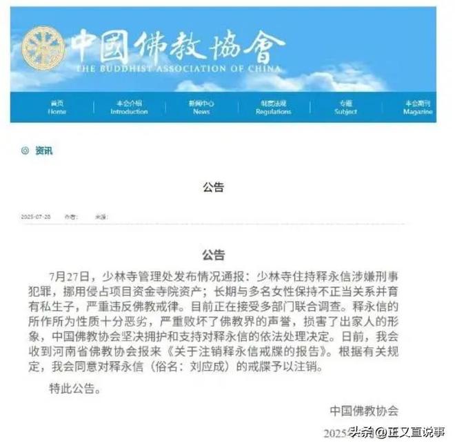 如今一语成谶,种种征兆早已预示结局。从深夜被带走,到官方通报,前后仅三天时间,如此迅速的处理,只能说明一点:所有证据早已确凿,只等一个恰当的时机。7月28日,中国佛教协会发布公告,鉴于事件影响恶劣,决定注销释永信的戒牒。普通人或许不了解“戒牒”的意义,但对僧人而言,这比身份证更为重要。