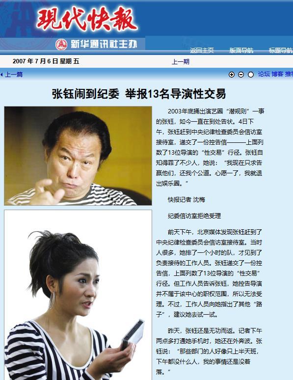信息来源:原文登载于现代快报2007年7月6日关于“张钰闹到纪委 举报13名导演易”的报道