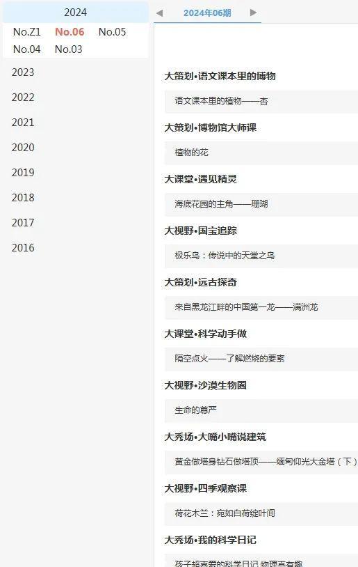 2.《天天爱科学》常设栏目或收稿范围(方向):大视野·四季观察课、大策划·语文课本里的博物、大策划·博物馆大师课、大策划·远古探奇、大秀场·大嘴小嘴说建筑、大课堂·科学动手做、大课堂·遇见精灵、大课堂·清洁城市、大视野·文明巡礼、大视野·我的营地生活、大视野·行走中国、大秀场·漫话科学、大秀场·小小发现者、大视野·国宝追踪、大视野·自然宝藏、大视野·沙漠生物圈、大秀场·我的科学日记、大课堂·十万个为什么、大视野·气象万千.创新、教育现场、理论新知、文艺·体育