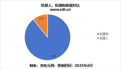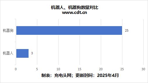 充电头网本次统计数据显示,机器狗占比 89%,AI机器人占比11%。而在实际数量方面,机器狗有25款数量远高于机器人的3款。
