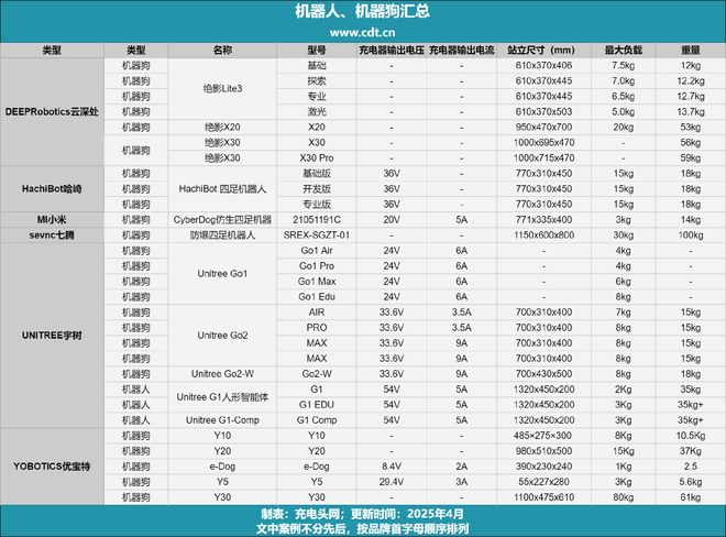 当前,工业、服务、特种作业等繁杂、高危领域对机器人的需求呈指数级增长,拥有庞大蓝海市场。为此,充电头网先行统计市面常见AI机器人、机器狗所采用的充电功率、尺寸、复杂重量等信息,旨为行业带来参考。