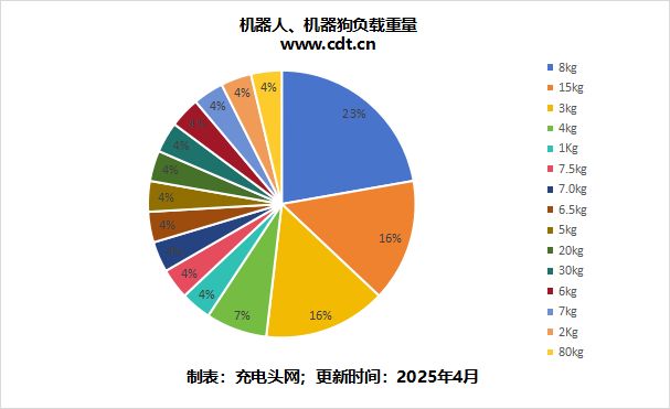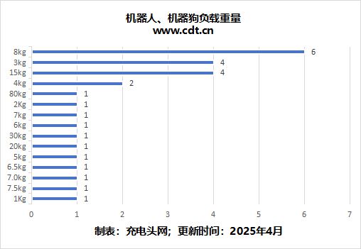 最后再来看机器人、机器狗负载重量的分布情况,可见负载8Kg和负载15k、3Kg的产品相对占比更高,分别为23%、16%和16%。实际产品数量为6款、4款和4款。其他负载重量区间均少于等于2款。