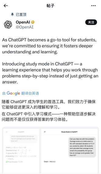 OpenAI在置顶于X平台的公告上表示,“学习模式”的上线主要源于ChatGPT已成为学生群体的首选工具,该模式旨在帮助学生深化理解、提升学习效果。