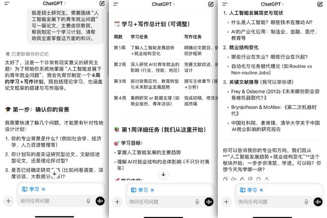 为验证ChatGPT“学习模式”的实际效果,《科创板日报》记者进行了实测。记者开启该模式后,输入以下请求:“我是硕士研究生,需要围绕‘人工智能发展下的青年就业问题’写一篇论文,主要由你教我,帮我制定一个学习计划,请帮助我全面掌握这方面的知识。”