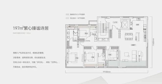 ,11层建筑中,实际仅10套珍稀房源。197㎡宽敞户型,配备四房两厅三卫,独具匠心的双套房布局;南向超宽面达19.1米,四面环绕采光与通风,居住舒适度极佳;阳台深度约2.4米,配备双阳台及多个飘窗,优化空间布局,实现高达95%的得房率,计入电梯前室面积,得房率可逼近99%。