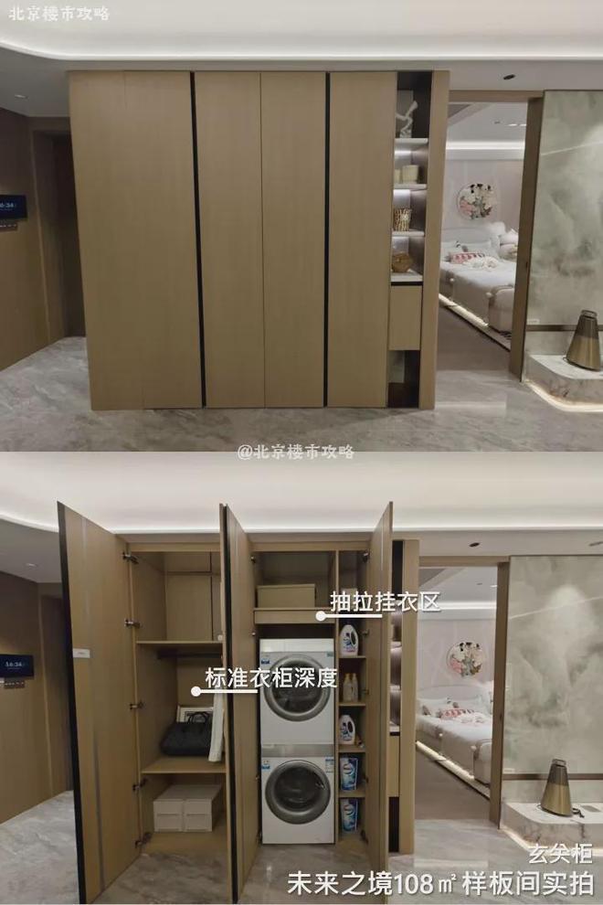 墙面是低饱和木色,家政柜柜体收纳做的比较满,人性化的收纳分区。除了洗烘机,还有收纳家用小物件以及大件衣物的空间。