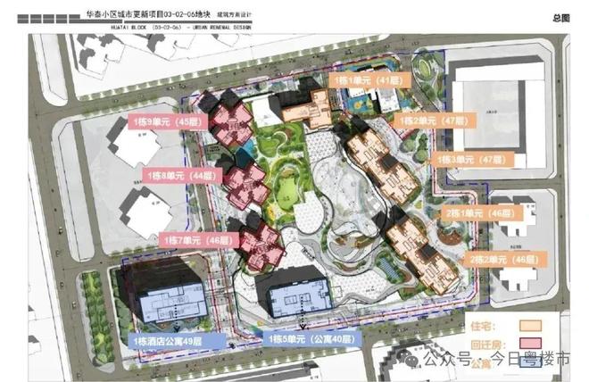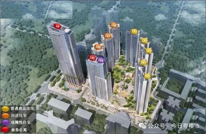 项目住宅产品建设用地面积约 4.1 万㎡,计容建面约 29万㎡,容积率 7.03,规划机动停车 2681 辆。项目由5栋住宅(1#1、1#2、1#3,2#2、2#3)、1栋(1#4)保障房、3栋(1#6、1#7、1#8)回迁房组成、1栋(1#5)公寓组成。