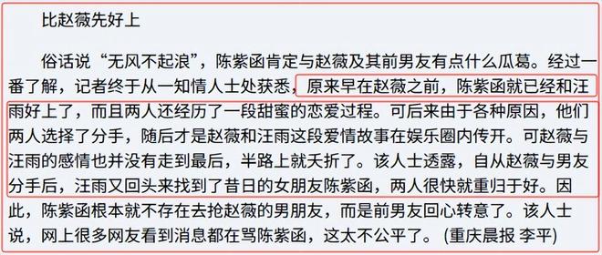 有记者深扒,询问了一名知情人,此人爆料,其实在汪雨和赵薇之前,陈紫函就已经和汪雨好了,两人还经历了一段甜蜜的恋爱,可后来由于种种原因,陈紫函和汪雨分开,随后汪雨就和赵薇好上了。